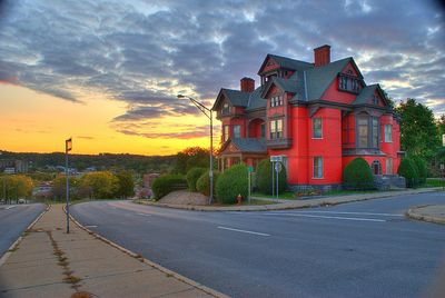 The Greene Mansion at 92 Market Street features a two-story brick construction with a steep slate roof and decorative wooden balconies.