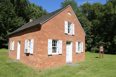 The Gunpowder Meetinghouse stands as a one-room brick structure with traditional architectural elements at the Aberdeen Proving Ground in Harford County.