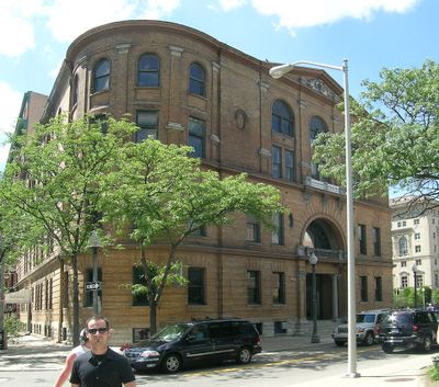 The building displays early examples of Beaux Arts design in Detroit, with ornate features including a central Ionic ordered entrance under a broad arch.