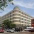 The structure exhibits Streamline Moderne architecture with smooth lines and curved corners, representing a significant period in American commercial building design.