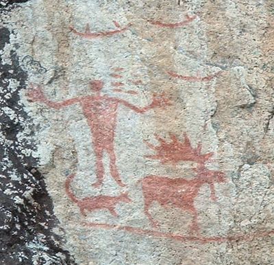 The Anishinaabe interpretation connects the central human figure to Orion constellation, known as Winter-maker in Ojibwe astronomical traditions.
