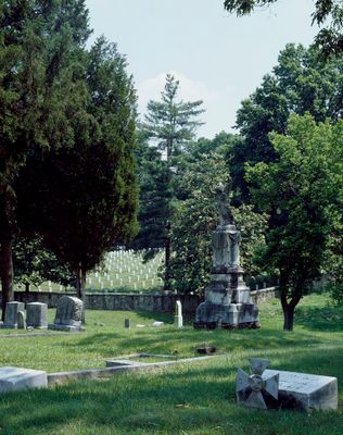 Historic Oakwood Cemetery extends across 102 acres of rolling hills with monuments, oaks, cedars, flowering trees, and a meandering stream near downtown Raleigh.