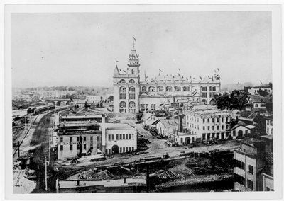The Industrial Exposition Building featured eight stories with a modified Renaissance exterior and a 240-foot corner tower at its northwest section.