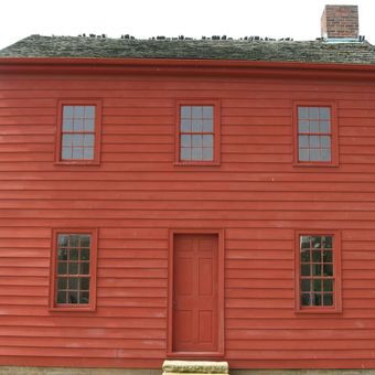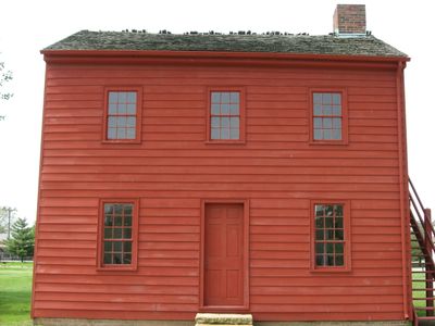 The Indiana Territorial Capitol features a two-story wooden frame construction with symmetrical windows and a central entrance reflecting early American architectural design points.