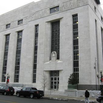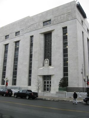 The five-story stone courthouse features Art Deco design elements, Vermont Eureka marble walls, and two light courts that allow natural illumination throughout the building.