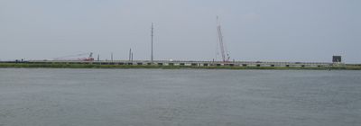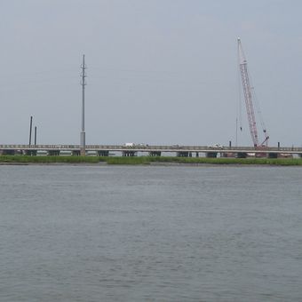 While crossing the causeway, travelers can observe the NASA Wallops Flight Facility's satellite dishes and aerospace operations behind security fencing.