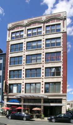 The six-story red brick structure at 1250 Library Street features limestone details and three bays of triplet windows on each floor.