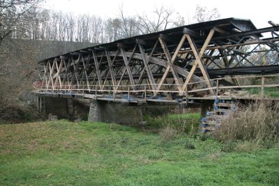 Built in 1874 by Jacob N. Bower, this bridge employs the Smith truss system and received reinforcing arches in 1912 to support increased traffic loads.