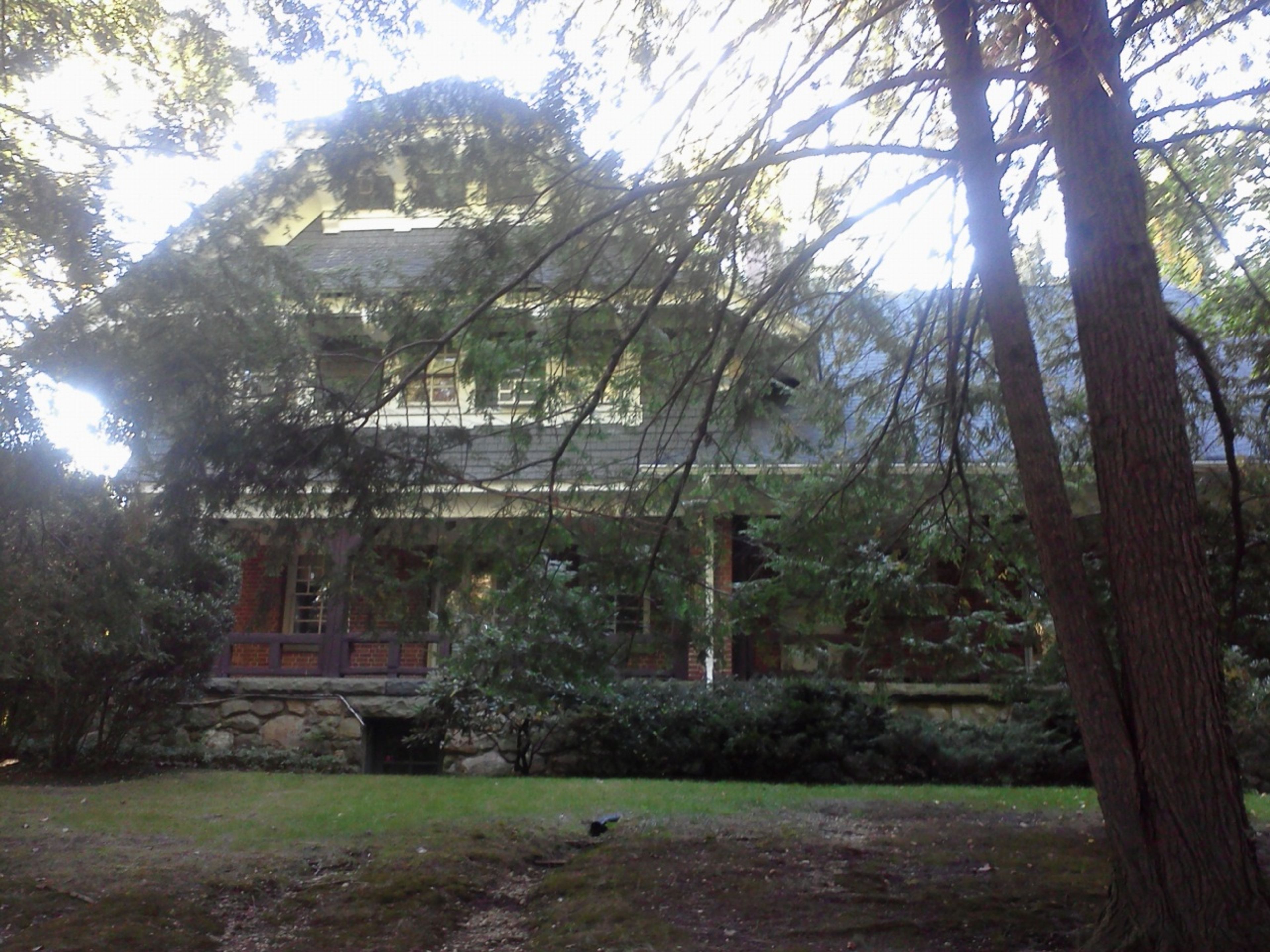 The Mackay Estate Dairyman's Cottage features a two-story frame structure with brick first floor, steep flaring roof, and rectangular windows with flat brackets.