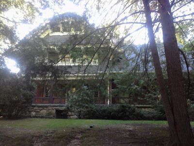 The cottage design incorporates Japanese architectural elements through its deep projecting eaves and specific window arrangements, representing early 20th-century American residential influences.