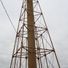 The cylindrical metal tower rises 32 meters above the Massachusetts coast with a black lantern and light brown painted exterior structure.