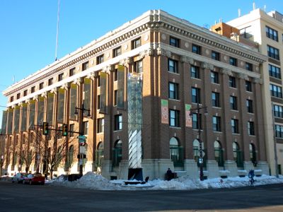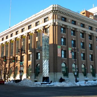 The Marine Corps Supply Activity spans one acre and features five stories of red brick construction with stone details and Ionic pilasters.