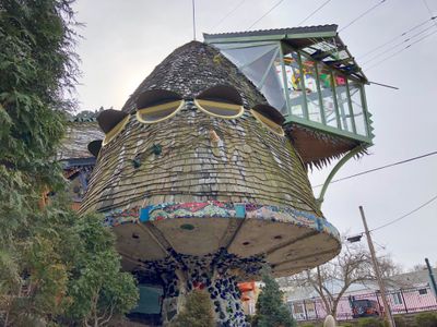 The Mushroom House is a residential building in Hyde Park featuring warped cedar shingles, circular porthole windows, and a cone-shaped glass room extending from its main structure on Erie Avenue. The distinctive form resulted from custom craftsmanship and experimental construction techniques.