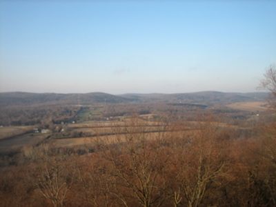 Musconetcong Mountain forms a ridge that runs parallel to the Musconetcong River, reaching an elevation of 935 feet at its highest point, Point Mountain.