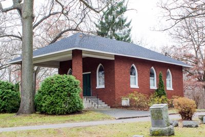The Oakwood Cemetery Chapel features brown brick construction with Gothic-style windows and a hipped roof extending to form a porte cochere.