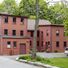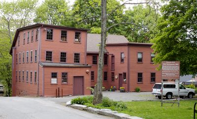 The Old Schwamb Mill features a U-shaped building reaching three stories high, with clapboard siding and multiple sections including flat and gabled roofs.