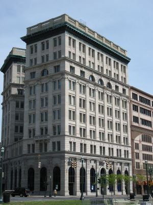 The Onondaga County Savings Bank Building stands at the intersection of Erie Boulevard and Salina Street, featuring architectural elements from the late 19th century.