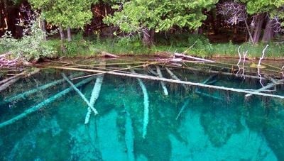 The Kitch-iti-kipi spring extends 200 feet across and reaches depths of 40 feet, continuously releasing 10,000 gallons of water each minute through limestone fissures.