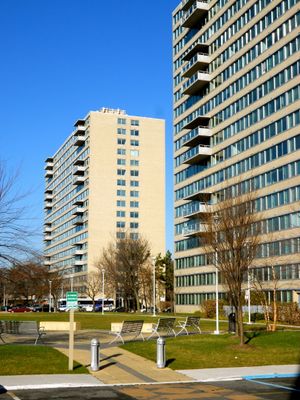 The complex represents post-war American architectural development through its International style design, reinforced concrete construction, and modernist rectangular forms.