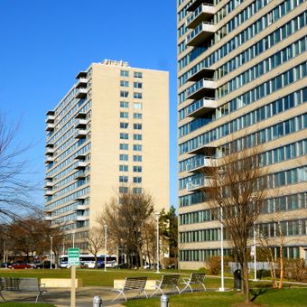 Park Towne Place features four eighteen-story buildings with limestone-tan brick, white marble, and aluminum trim across a 10-acre property in Philadelphia.