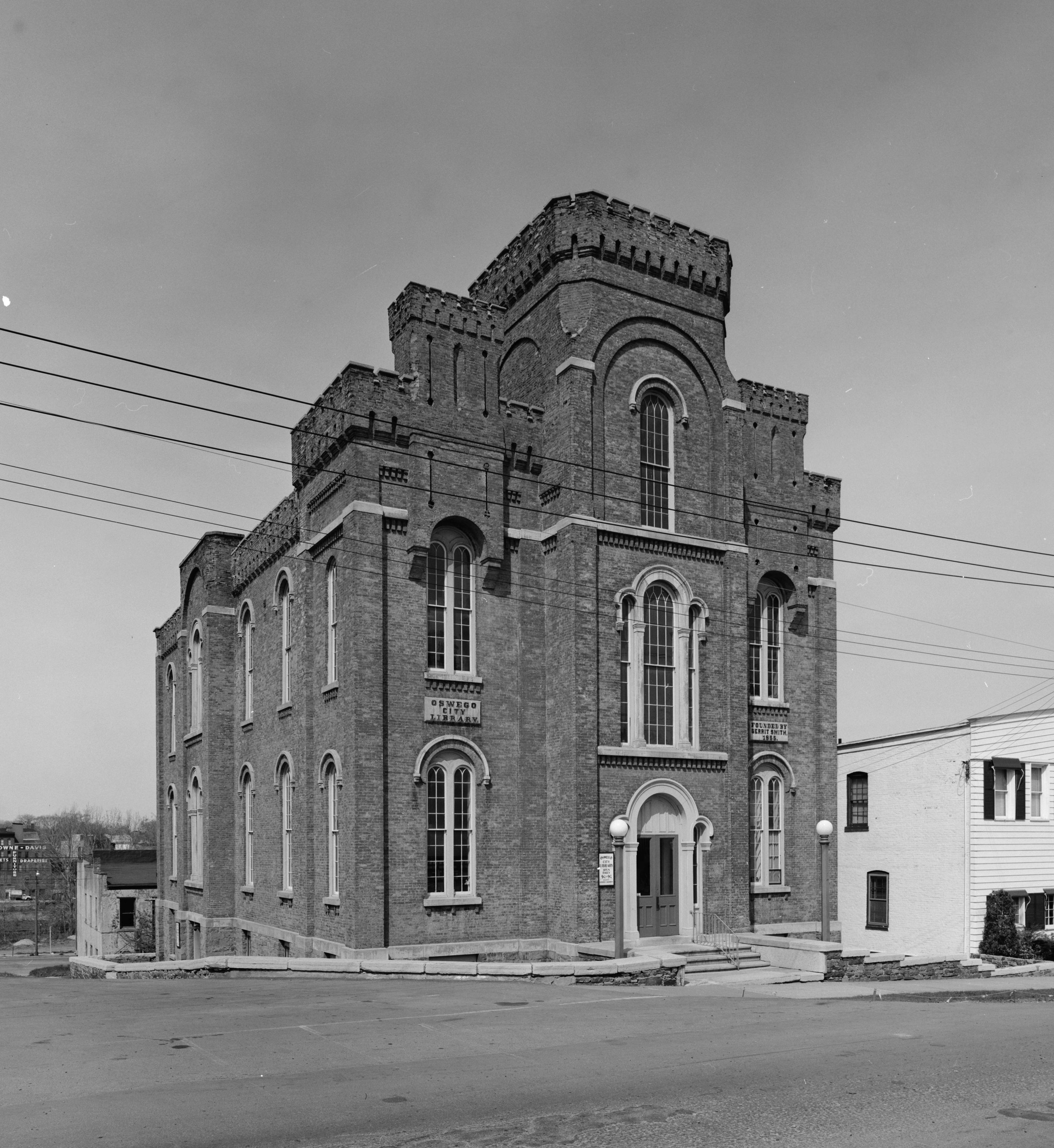 The two-story brick building features brick exterior battlements, a tower, turrets, corbels, and multiple arcaded windows spanning the facade.