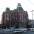 The three-story Second Empire brick building exhibits a square layout with central projecting sections and a mansard-style roof featuring corner turrets.