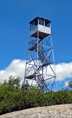 The 40-foot steel frame tower sits atop Poke-O-Moonshine Mountain at 2,165 feet elevation, providing extensive views of the Adirondacks and Lake Champlain.