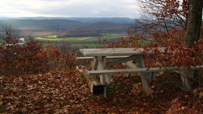 The Pocumtuck Ridge Trail extends 20 miles along a ridgeline, offering views of the Deerfield River and Connecticut River valleys from cliff faces.