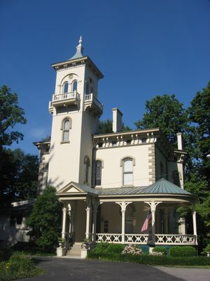 The building features original marble fireplaces, detailed woodwork, and stained glass windows that demonstrate 19th-century craftsmanship techniques.