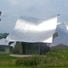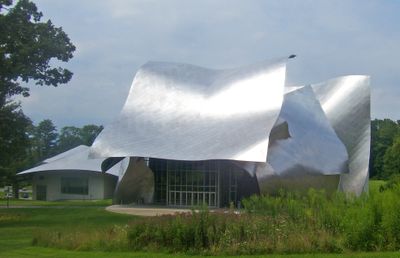 The structure features 5,647 stainless steel roof shingles and includes four rehearsal studios designed by architect Frank Gehry.