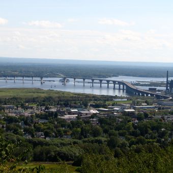 The Richard I. Bong Memorial Bridge stretches 11,800 feet across the Saint Louis River, connecting the cities of Superior, Wisconsin and Duluth, Minnesota.