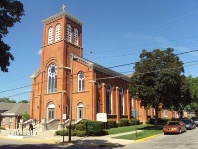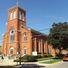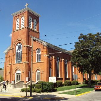 Saint Mary of Good Counsel Catholic Church features red-orange brick walls, a square pyramid-roof bell tower, and three front entrances with round-headed panels.