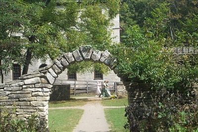 The restored 1817 limestone gristmill continues to produce cornmeal using water power, demonstrating nineteenth-century milling techniques.