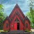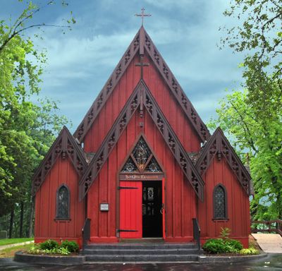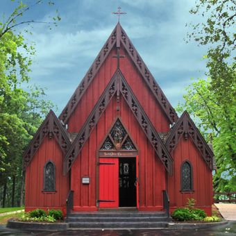 St. John Chrysostom Church features board and batten construction with vertical lines, pointed arches, and decorative wrought-iron hinges forged to resemble tree branches.