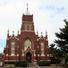 The red brick church with sandstone trim stands at 131 South Main Street, featuring a prominent tower and architectural elements of Greek Revival design.