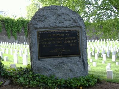 The inscription reads 'In Memory of Unknown Union Soldiers in This Cemetery 1861-1865 Erected by Kentucky Comrades—1914' marking the burial site of unidentified soldiers.