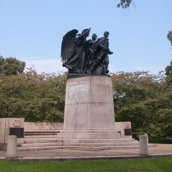 The Union Soldiers and Sailors Monument features marble reliefs depicting military charges, with a figural group showing Bellona and Victory atop a granite base.
