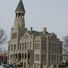 The Washington County Courthouse features Richardsonian Romanesque architecture with a five-story corner clock tower and conical roof, constructed from local limestone.