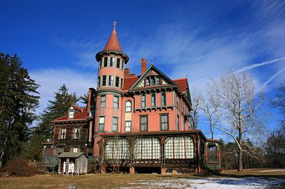 The mansion features a five-story circular tower, multi-gabled attic, and extensive verandah overlooking the Hudson River and distant mountains.