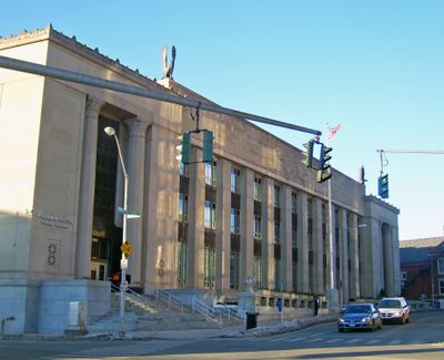 The federal building, completed in 1933, replaced an older Second Empire-style post office during a period of governmental expansion in the Great Depression.