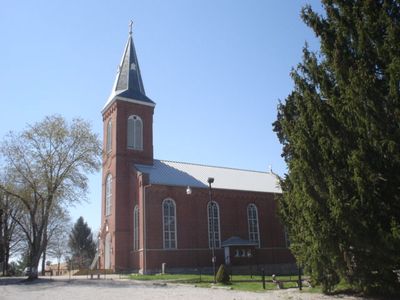 German immigrants from Baden established the first log church in 1828, while the current stone structure was completed under Reverend Francis Krieger in 1884.