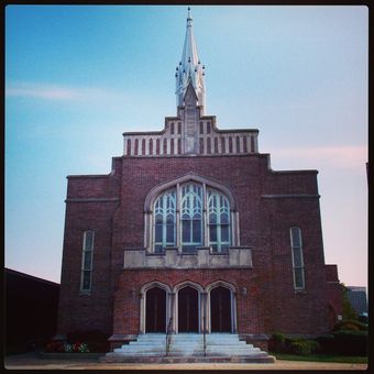 The rectangular brick church features Gothic pointed arch windows and a prominent spire rising above the main facade at 413 Brambleton Avenue.