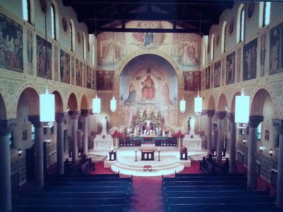 The church at 414 Olive Street featured early Christian Basilica architecture with traditional design elements and religious decorative artworks inside.
