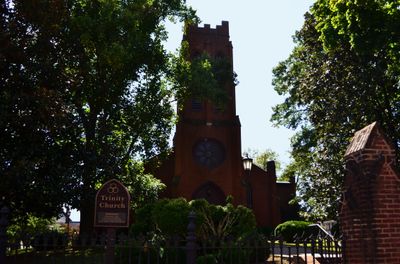 The Trinity Episcopal Church features a brick structure with widened aisles, extended chancel, and stained glass windows displaying various artistic styles throughout the building.