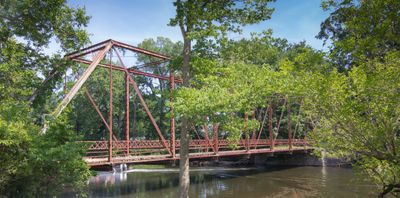 The Marantette Bridge extends 141 feet in length and 16 feet in width, featuring a Pratt through truss design with eight panels and pinned connections.