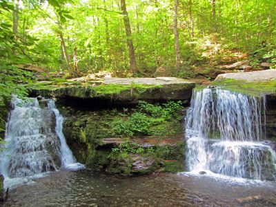 Multiple mini waterfalls line the shorter trail route, creating natural stepping stones toward the main double cascade formation.