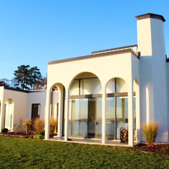 The property features a 1970s Postmodern design by architect Thomas Church, incorporating minimal design elements and natural landscapes with river perspectives.