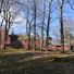 The wooden house features a central courtyard layout with varied roof types and a conical turret at its southwest corner.