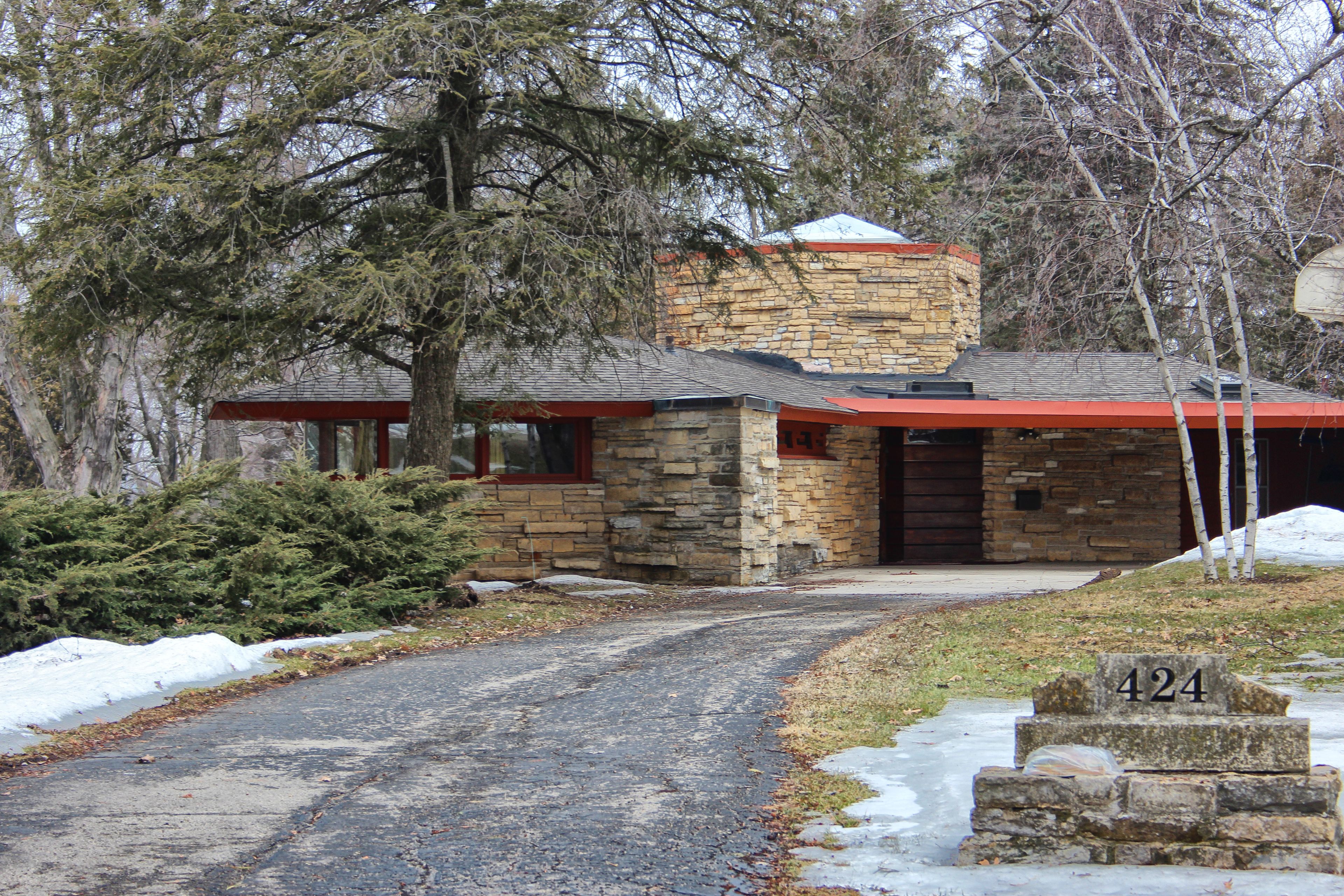 Frank Lloyd Wright designed this residence in 1951, and Patrick Kinney, a local lawyer, personally quarried stones daily before his court duties to construct the house.