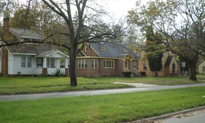 The neighborhood incorporates various architectural designs, including Bungalow and Craftsman styles, with houses clad in brick, stucco, or wood materials.